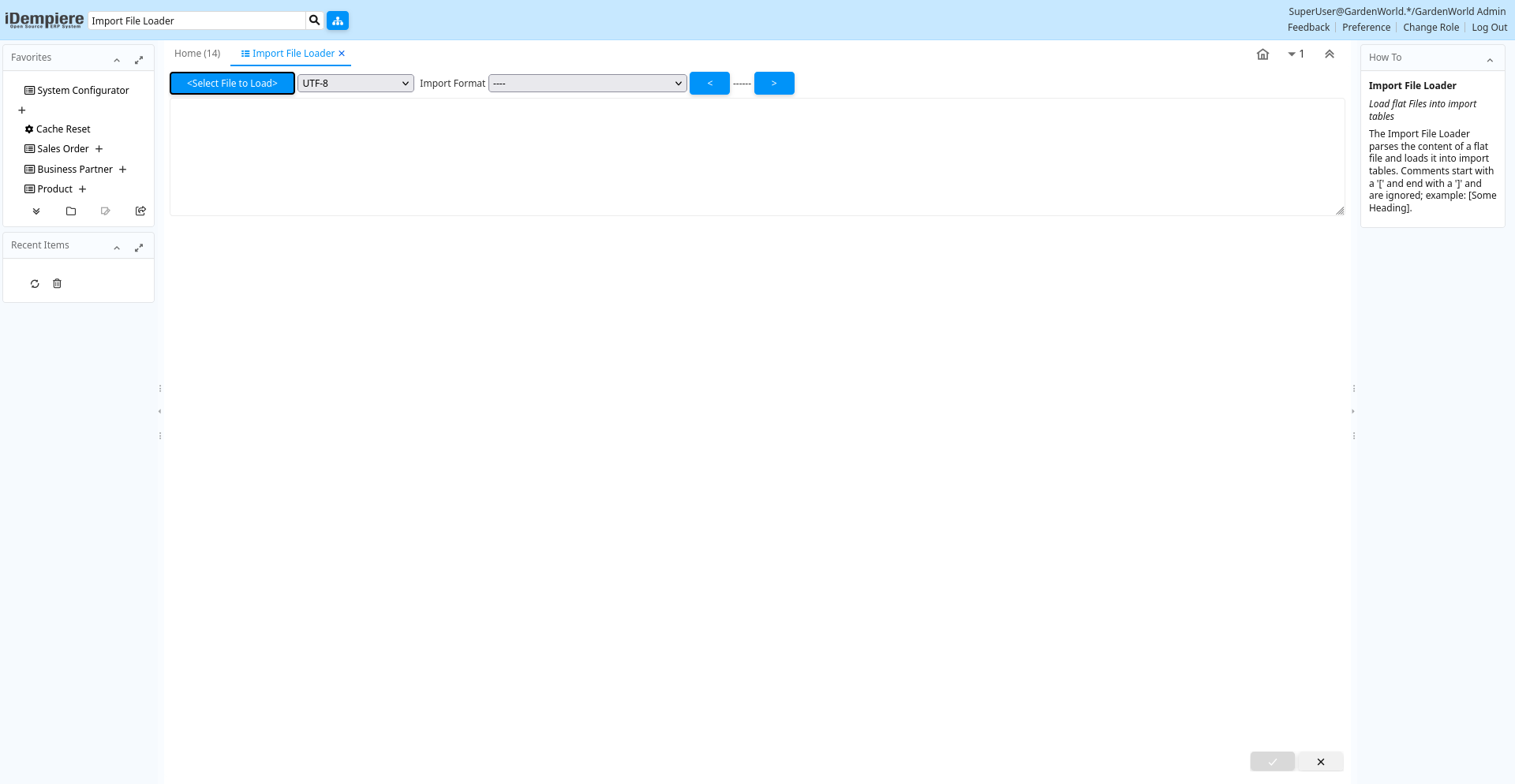 Help: The Import File Loader parses the content of a flat file and loads it into import tables. Comments start with a '[' and end with a ']' and are ignored; example: [Some Heading].