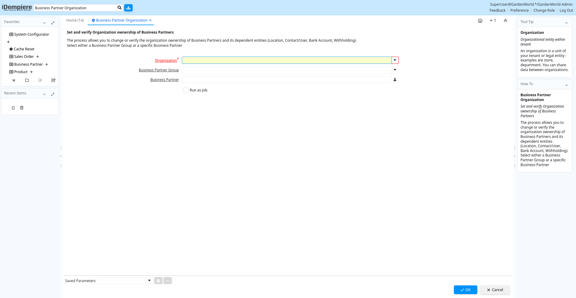 Help: The process allows you to change or verify the organization ownership of Business Partners and its dependent entities (Location, Contact/User, Bank Account, Withholding). Select either a Business Partner Group ar a specific Business Partner
