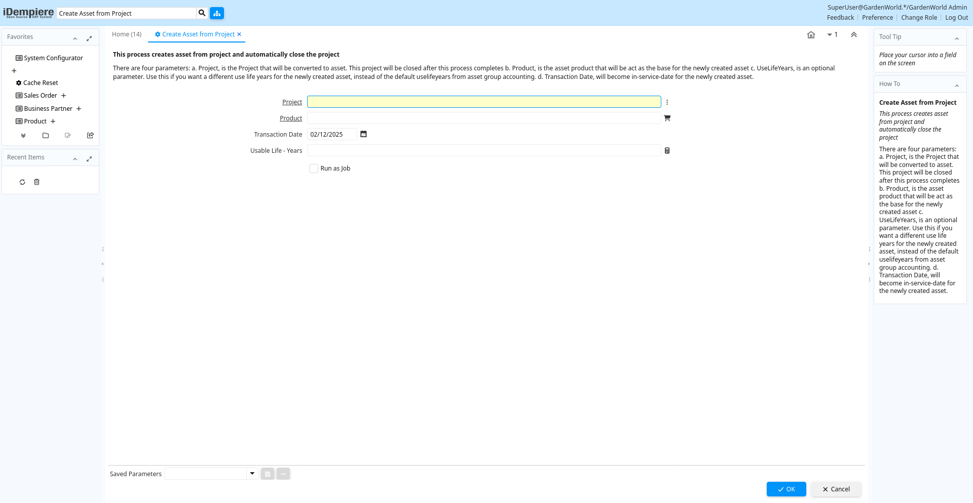 Help: There are four parameters:a. Project, is the Project that will be converted to asset. This project will be closed after this process completesb. Product, is the asset product that will be act as the base for the newly created assetc. UseLifeYears, is an optional parameter. Use this if you want a different use life years for the newly created asset, instead of the default uselifeyears from asset group accounting.d. Transaction Date, will become in-service-date for the newly created asset.