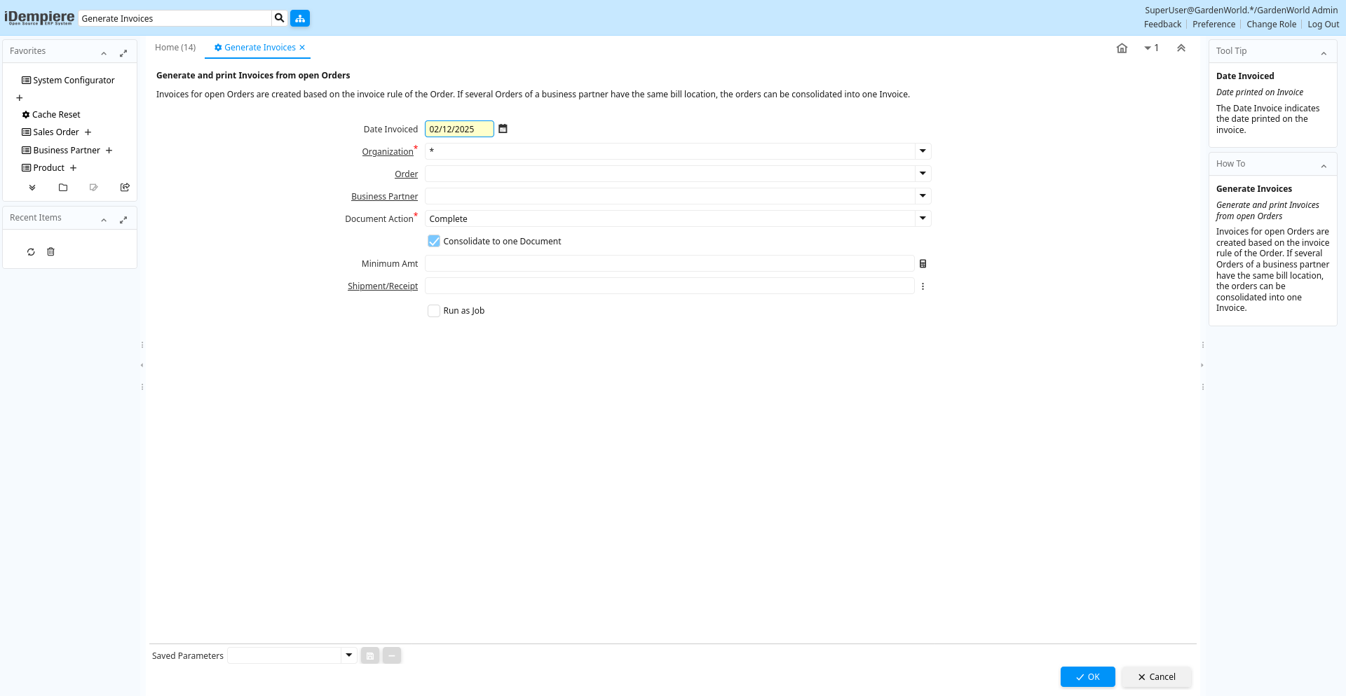 Help: Invoices for open Orders are created based on the invoice rule of the Order.If several Orders of a business partner have the same bill location, the orders can be consolidated into one Invoice.
