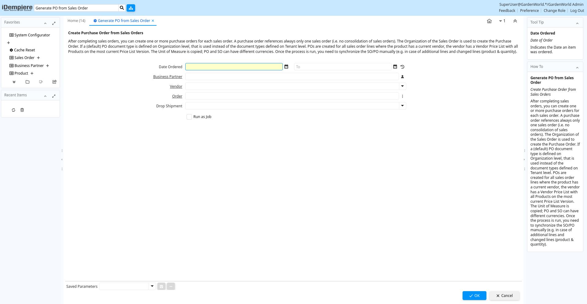 Help: After completing sales orders, you can create one or more purchase orders for each sales order. A purchase order references always only one sales order (i.e. no consolidation of sales orders). The Organization of the Sales Order is used to create the Purchase Order. If a (default) PO document type is defined on Organization level, that is used instead of the document types defined on Tenant level.POs are created for all sales order lines where the product has a current vendor, the vendor has a Vendor Price List with all Products on the most current Price List Version. The Unit of Measure is copied; PO and SO can have different currencies.Once the process is run, you need to synchronize the SO/PO manually (e.g. in case of additional lines and changed lines (product & quantity).