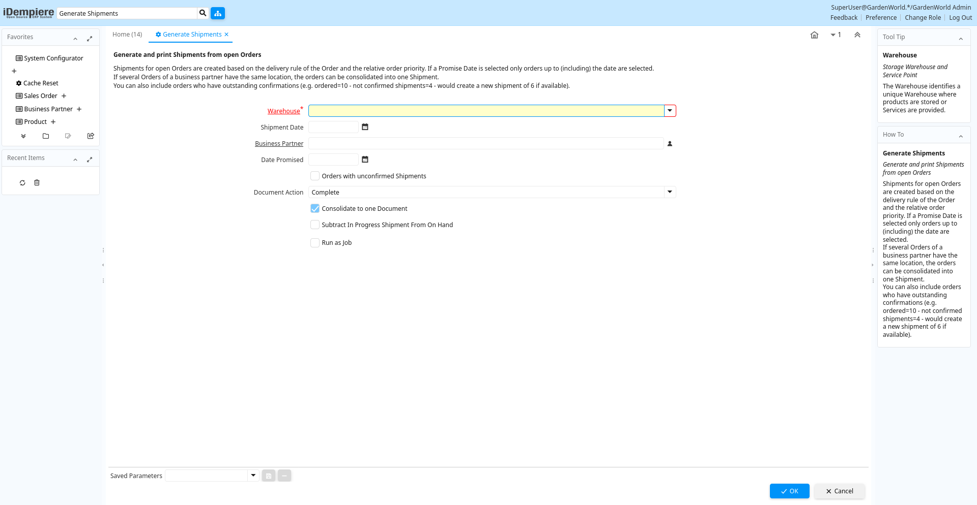 Help: Shipments for open Orders are created based on the delivery rule of the Order and the relative order priority. If a Promise Date is selected only orders up to (including) the date are selected.If several Orders of a business partner have the same location, the orders can be consolidated into one Shipment.You can also include orders who have outstanding confirmations (e.g. ordered=10 - not confirmed shipments=4 - would create a new shipment of 6 if available).