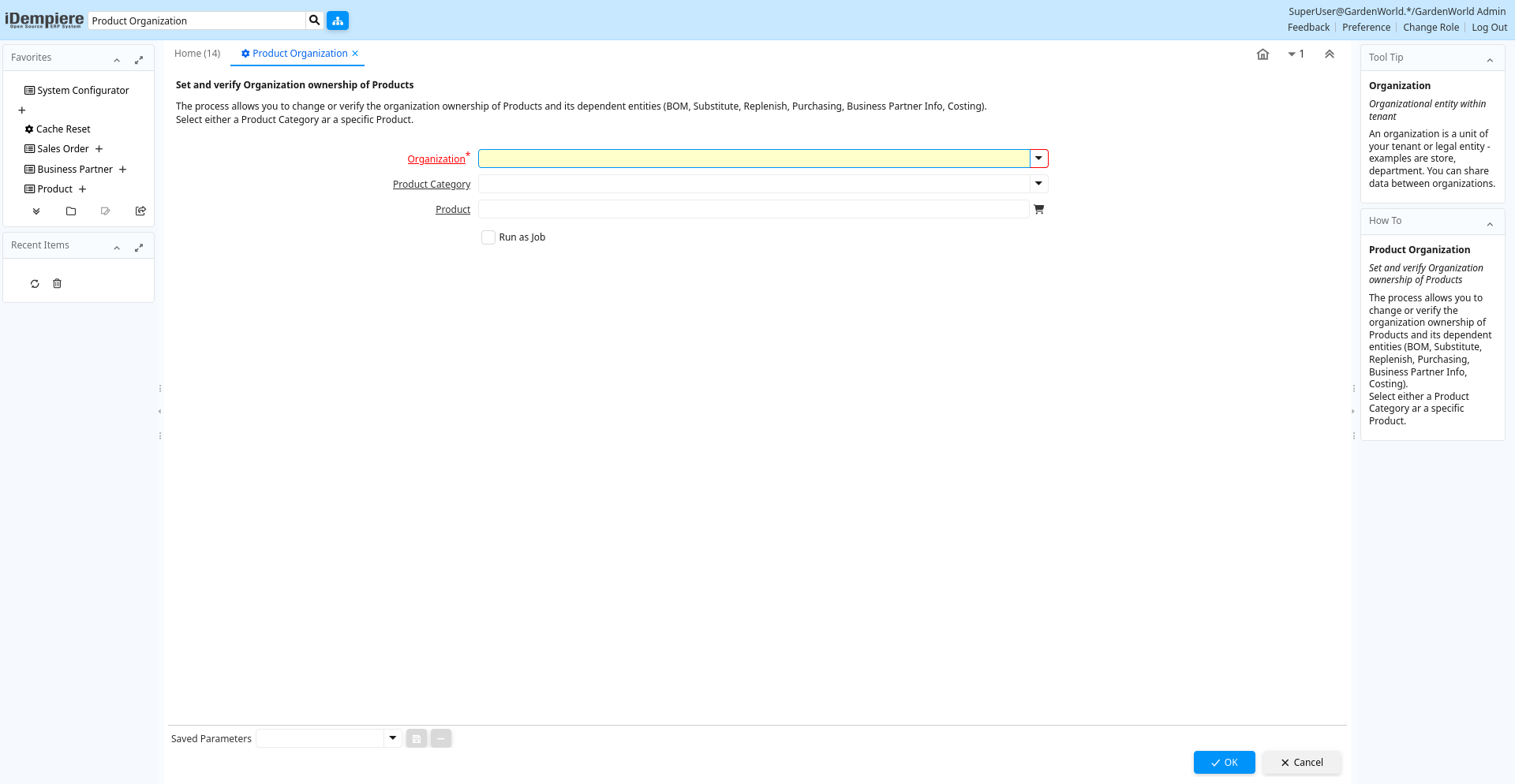 Help: The process allows you to change or verify the organization ownership of Products and its dependent entities (BOM, Substitute, Replenish, Purchasing, Business Partner Info, Costing). Select either a Product Category ar a specific Product.