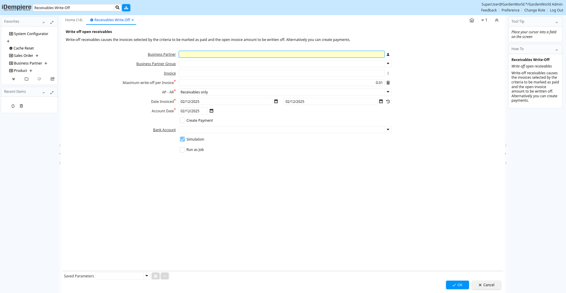Help: Write-off receivables causes the invoices selected by the criteria to be marked as paid and the open invoice amount to be written off. Alternatively you can create payments.