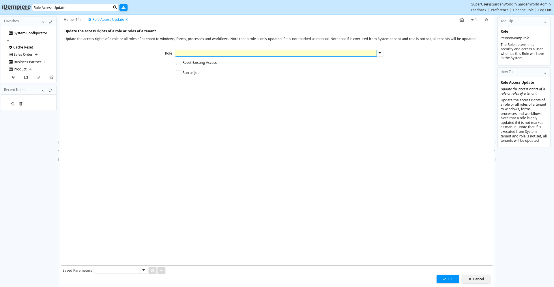 Help: Update the access rights of a role or all roles of a tenant to windows, forms, processes and workflows. Note that a role is only updated if it is not marked as manual. Note that if is executed from System tenant and role is not set, all tenants will be updated