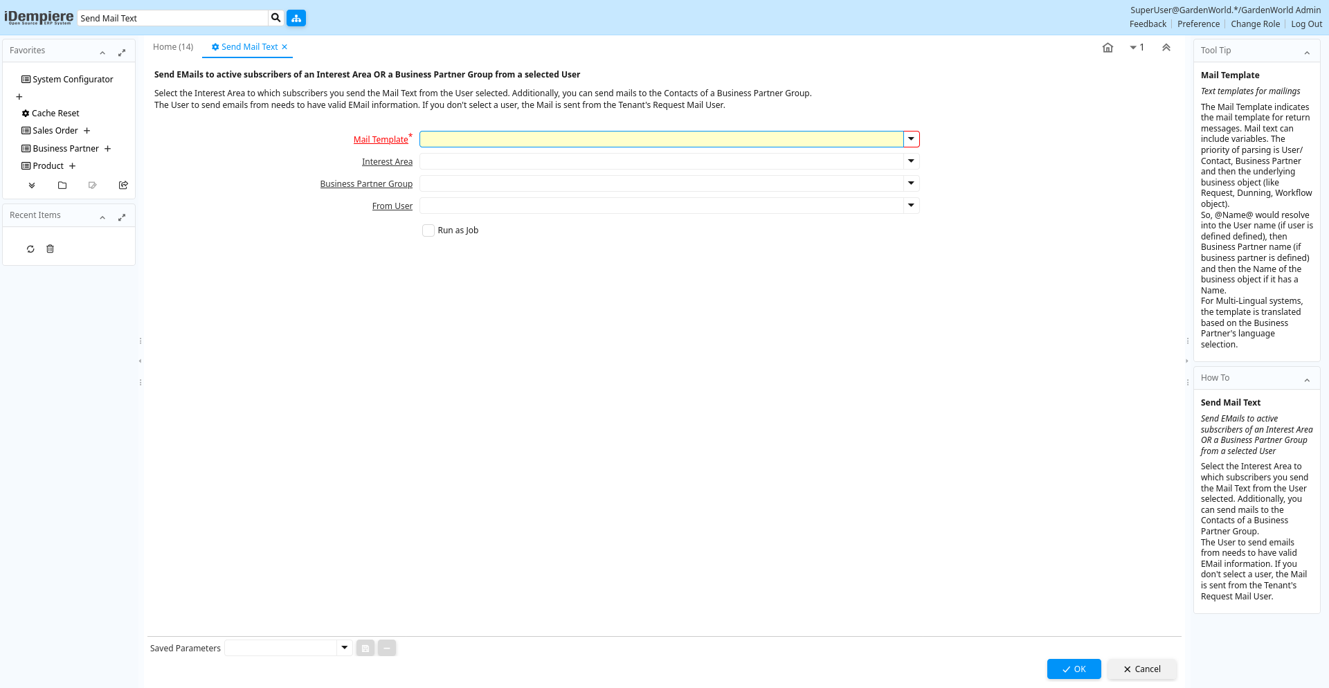 Help: Select the Interest Area to which subscribers you send the Mail Text from the User selected. Additionally, you can send mails to the Contacts of a Business Partner Group.The User to send emails from needs to have valid EMail information. If you don't select a user, the Mail is sent from the Tenant's Request Mail User.