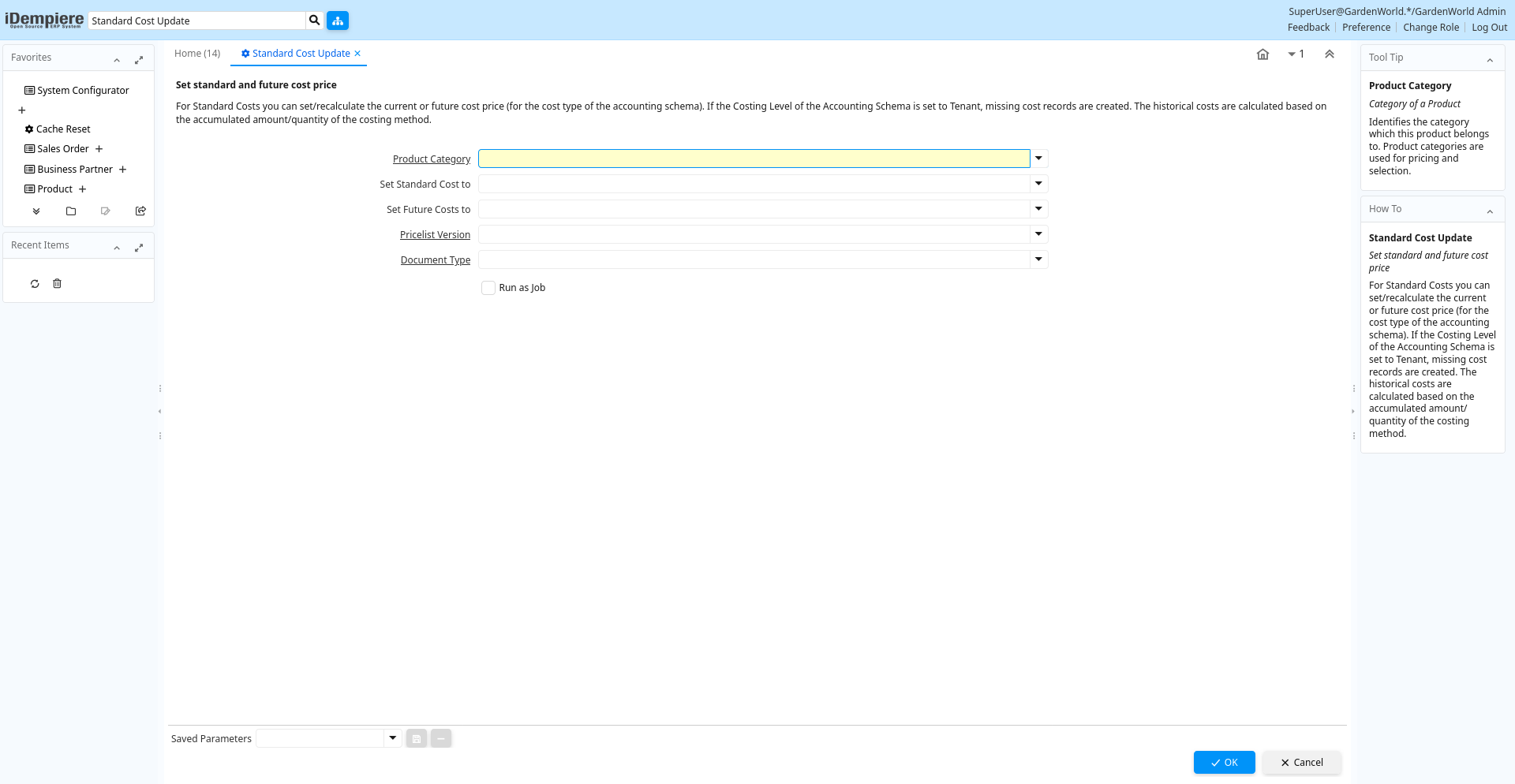 Help: For Standard Costs you can set/recalculate the current or future cost price (for the cost type of the accounting schema). If the Costing Level of the Accounting Schema is set to Tenant, missing cost records are created. The historical costs are calculated based on the accumulated amount/quantity of the costing method.