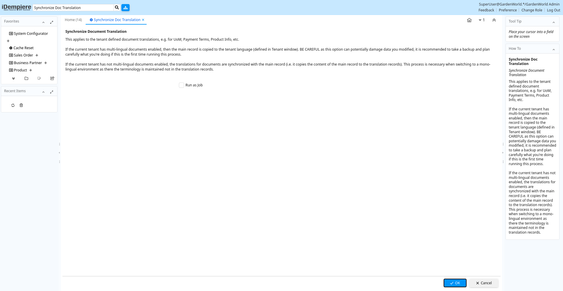 Help: This applies to the tenant defined document translations, e.g. for UoM, Payment Terms, Product Info, etc.If the current tenant has multi-lingual documents enabled, then the main record is copied to the tenant language (defined in Tenant window). BE CAREFUL as this option can potentially damage data you modified, it is recommended to take a backup and plan carefully what you're doing if this is the first time running this process.If the current tenant has not multi-lingual documents enabled, the translations for documents are synchronized with the main record (i.e. it copies the content of the main record to the translation records). This process is necessary when switching to a mono-lingual environment as there the terminology is maintained not in the translation records.
