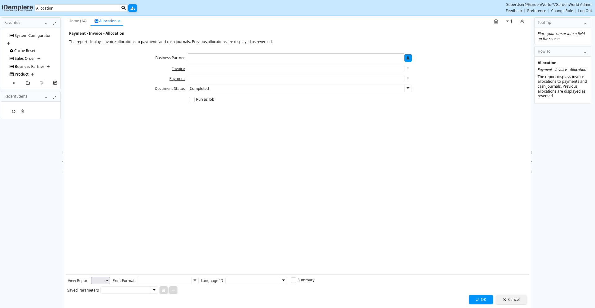 Help: The report displays invoice allocations to payments and cash journals. Previous allocations are displayed as reversed.