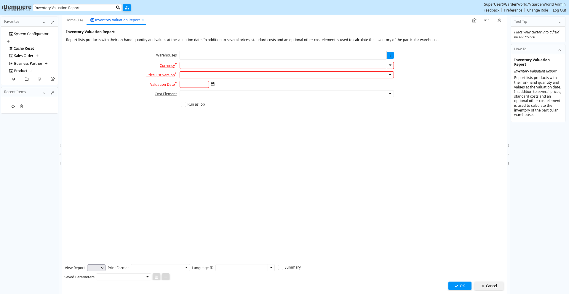 Help: Report lists products with their on-hand quantity and values at the valuation date. In addition to several prices, standard costs and an optional other cost element is used to calculate the inventory of the particular warehouse.