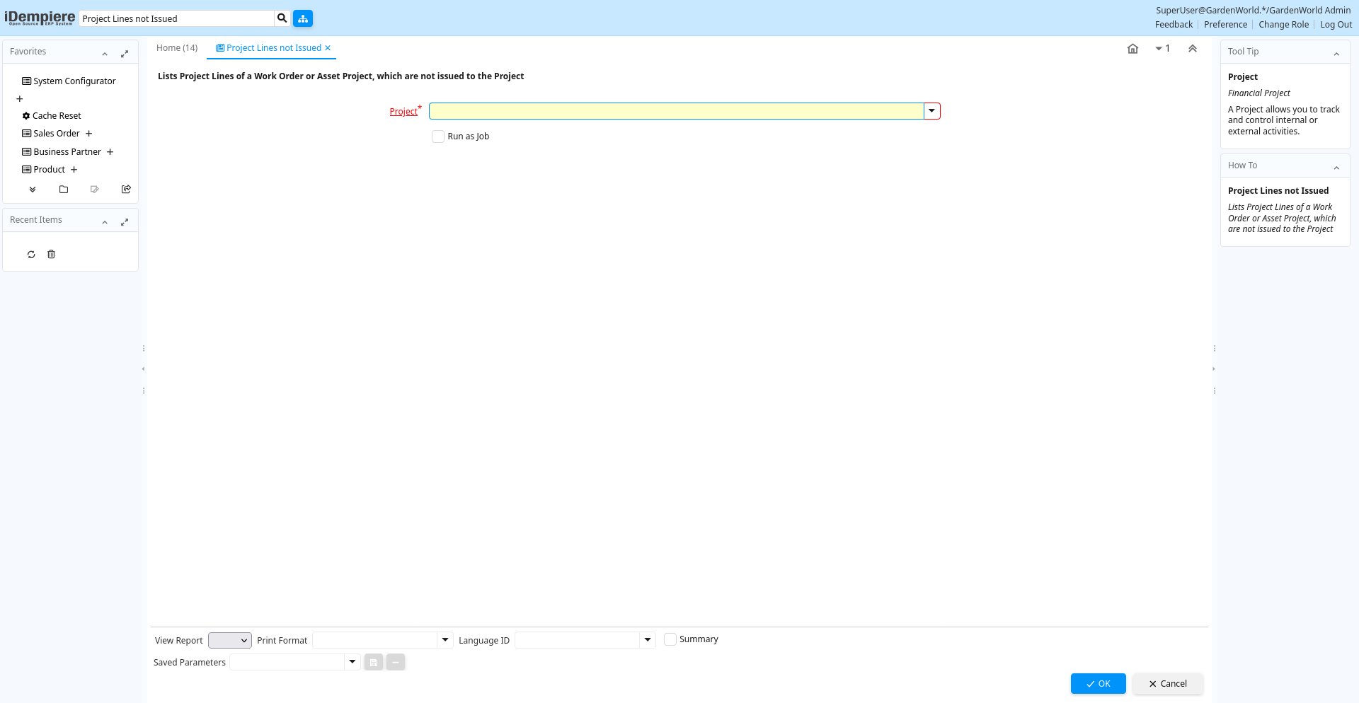 Description: Lists Project Lines of a Work Order or Asset Project, which are not issued to the Project