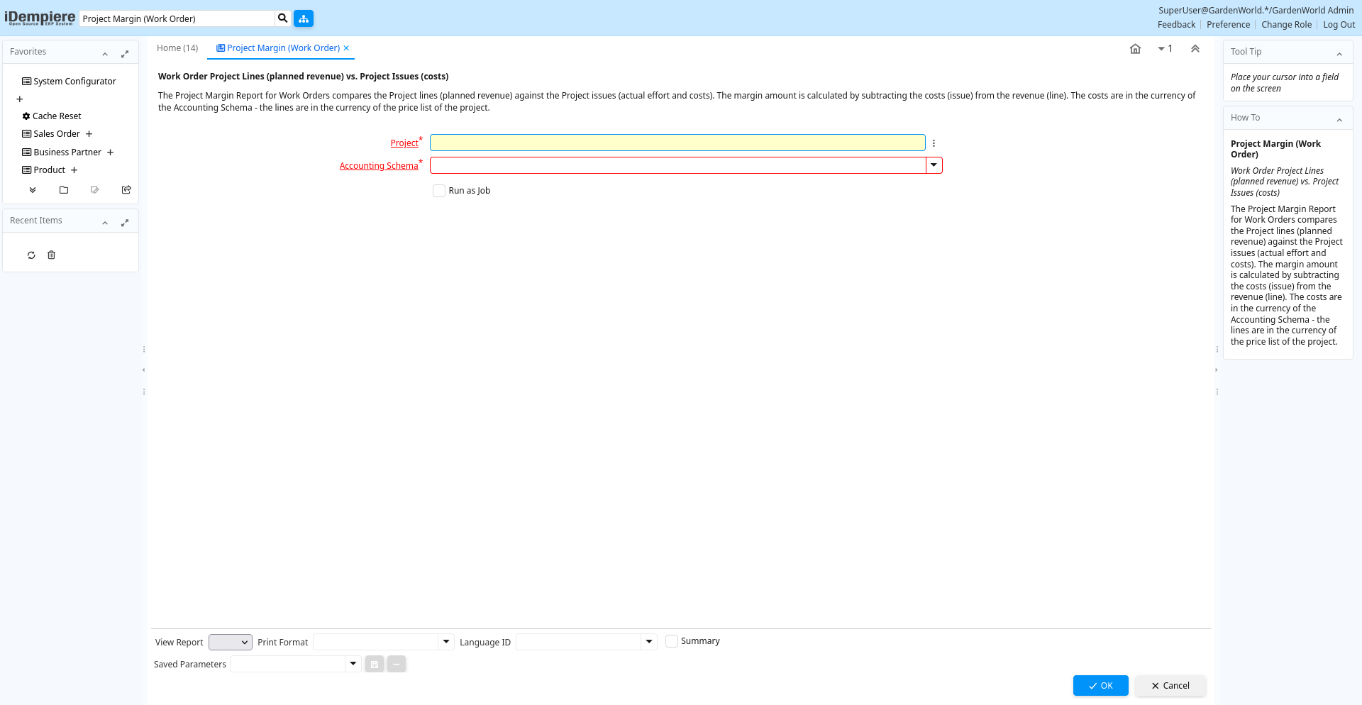 Help: The Project Margin Report for Work Orders compares the Project lines (planned revenue) against the Project issues (actual effort and costs). The margin amount is calculated by subtracting the costs (issue) from the revenue (line).The costs are in the currency of the Accounting Schema - the lines are in the currency of the price list of the project.