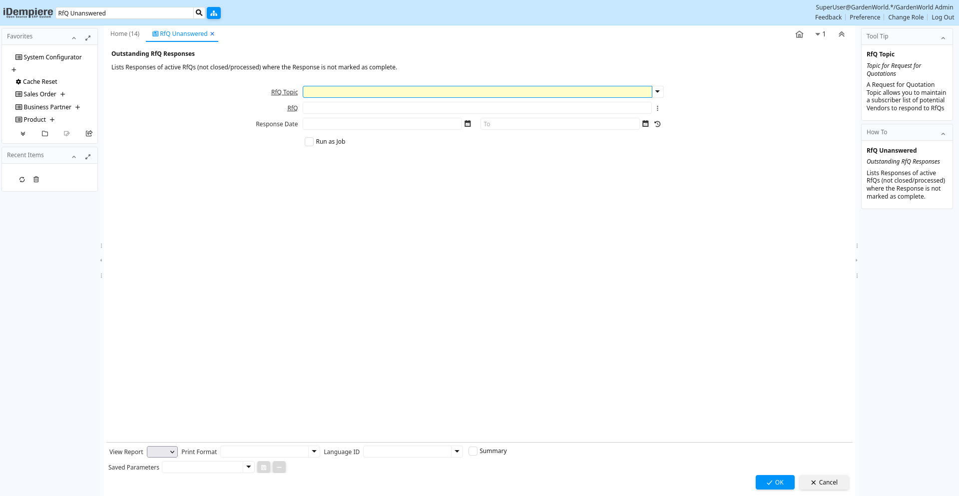 | RfQ | Request for Quotation | Request for Quotation to be sent out to vendors of a RfQ Topic. After Vendor selection, optionally create Sales Order or Quote for Customer as well as Purchase Order for Vendor(s) | C_RfQ_ID Search |