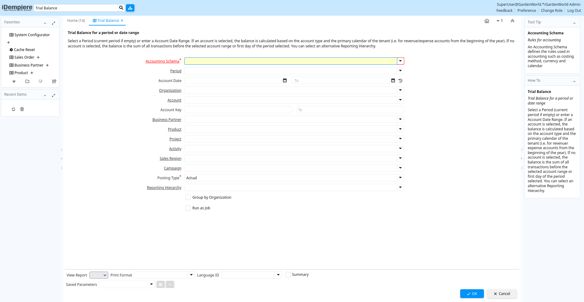 Help: Select a Period (current period if empty) or enter a Account Date Range. If an account is selected, the balance is calculated based on the account type and the primary calendar of the tenant (i.e. for revenue/expense accounts from the beginning of the year). If no account is selected, the balance is the sum of all transactions before the selected account range or first day of the period selected. You can select an alternative Reporting Hierarchy.
