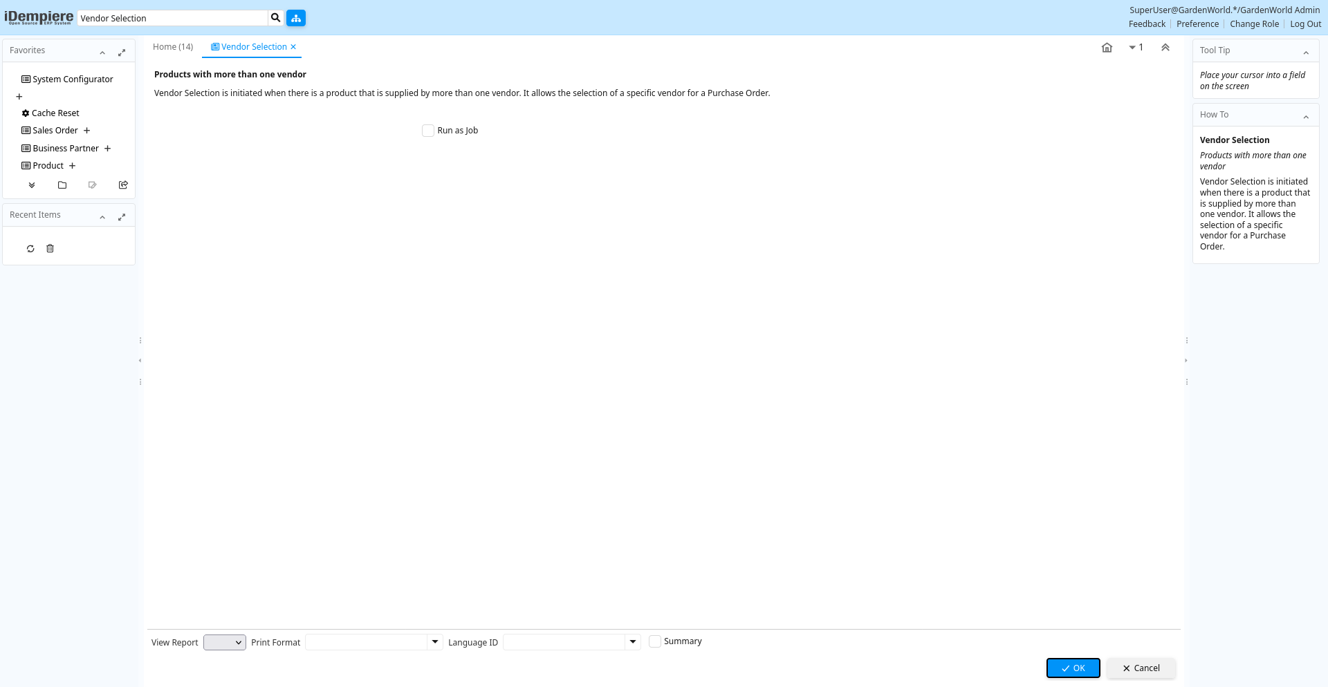 Help: Vendor Selection is initiated when there is a product that is supplied by more than one vendor. It allows the selection of a specific vendor for a Purchase Order.