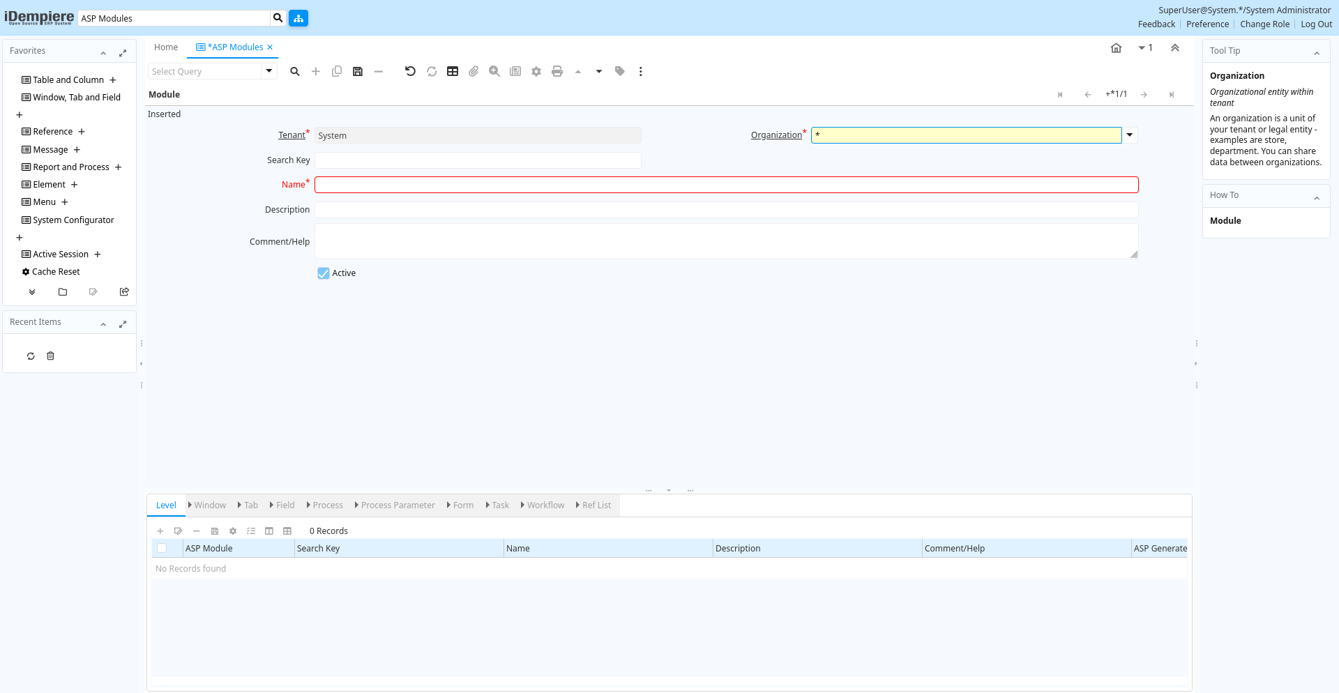 | Organization | Organizational entity within tenant | An organization is a unit of your tenant or legal entity - examples are store, department. You can share data between organizations. | asp_module.AD_Org_ID numeric(10) Table Direct |