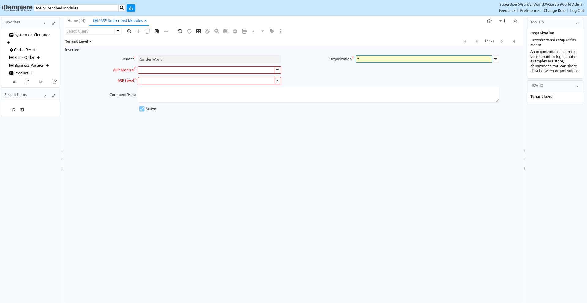 | Organization | Organizational entity within tenant | An organization is a unit of your tenant or legal entity - examples are store, department. You can share data between organizations. | asp_clientlevel.AD_Org_ID numeric(10) Table Direct |