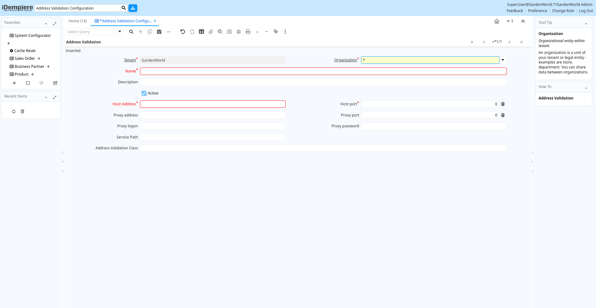 | Tenant | Tenant for this installation. | A Tenant is a company or a legal entity. You cannot share data between Tenants. | c_addressvalidationcfg.AD_Client_ID numeric(10) Table Direct |