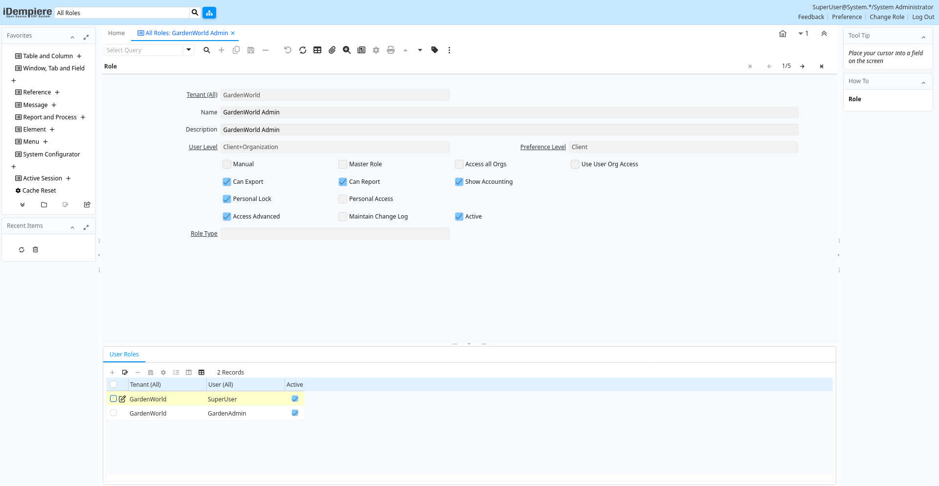 | User Level | System Tenant Organization | The User Level field determines if users of this Role will have access to System level data, Organization level data, Tenant level data or Tenant and Organization level data. | ad_allroles_v.UserLevel character(3) List |