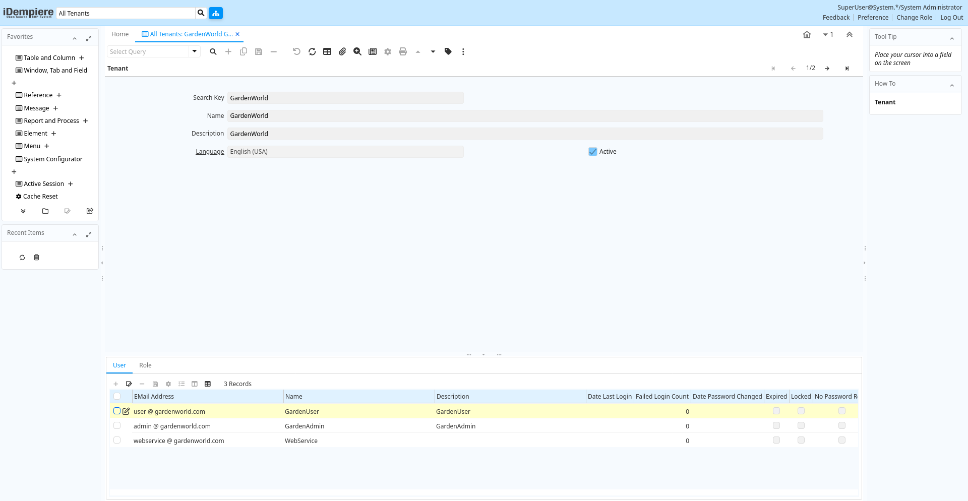| User Level | System Tenant Organization | The User Level field determines if users of this Role will have access to System level data, Organization level data, Tenant level data or Tenant and Organization level data. | ad_allroles_v.UserLevel character(3) List |
