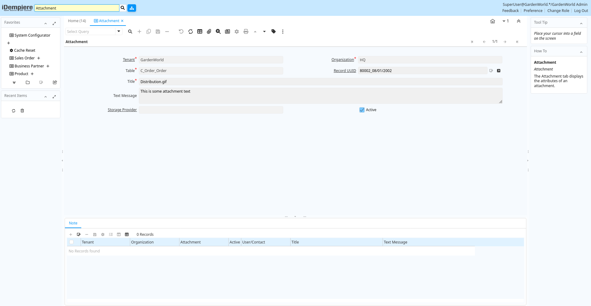 | Record ID | Direct internal record ID | The Record ID is the internal unique identifier of a record. Please note that zooming to the record may not be successful for Orders, Invoices and Shipment/Receipts as sometimes the Sales Order type is not known. | ad_attachment.Record_ID numeric(10) Record ID |