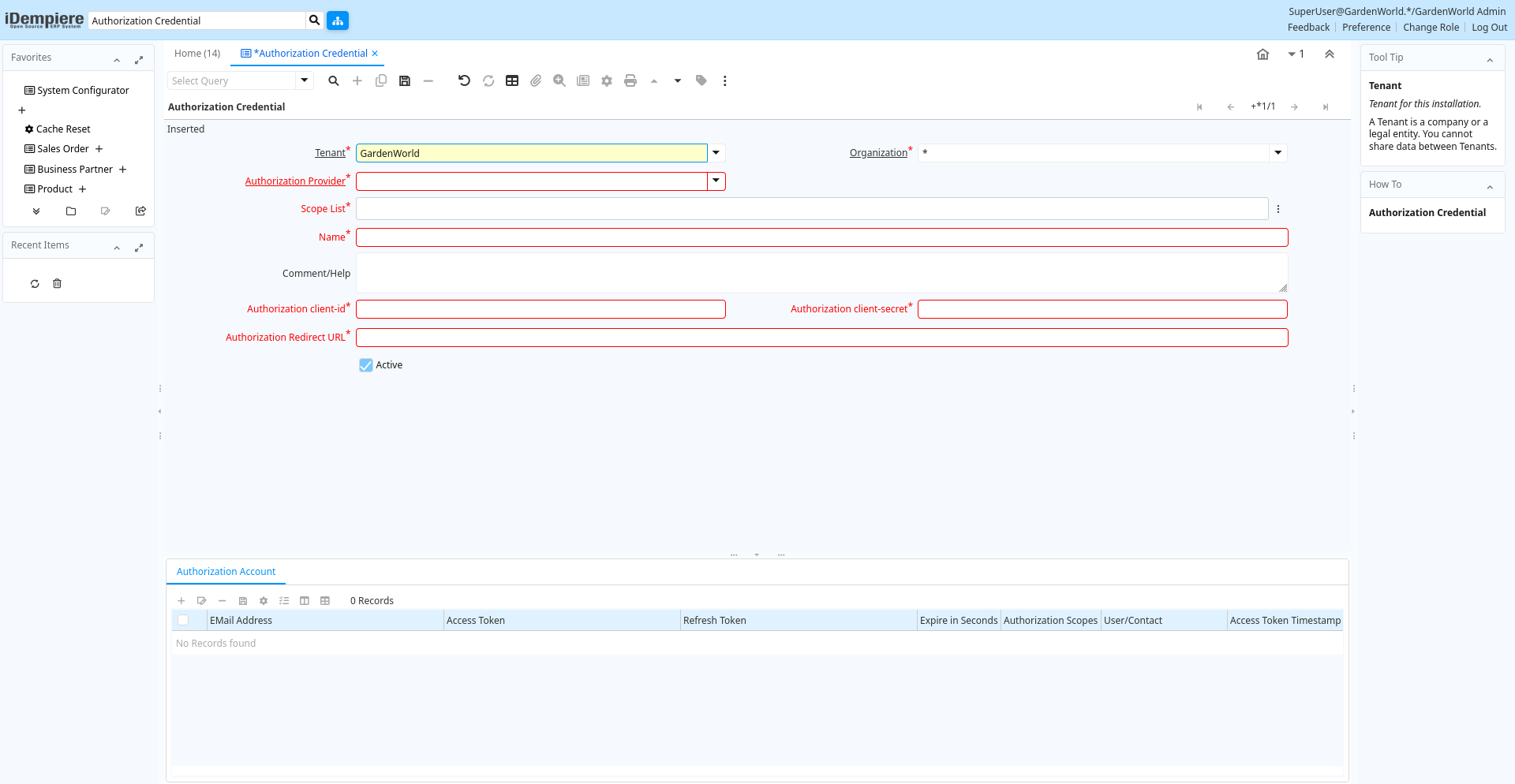 | Tenant | Tenant for this installation. | A Tenant is a company or a legal entity. You cannot share data between Tenants. | ad_authorizationcredential.AD_Client_ID numeric(10) Table Direct |