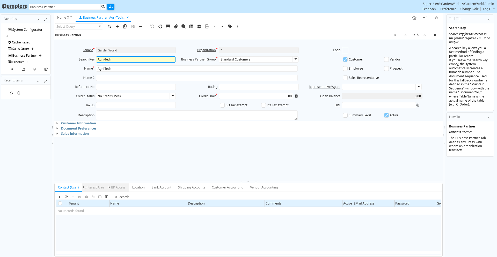 Help: The Business Partner window allows you do define any party with whom you transact. This includes customers, vendors and employees. Prior to entering or importing products, you must define your vendors. Prior to generating Orders you must define your customers. This window holds all information about your business partner and the values entered will be used to generate all document transactions