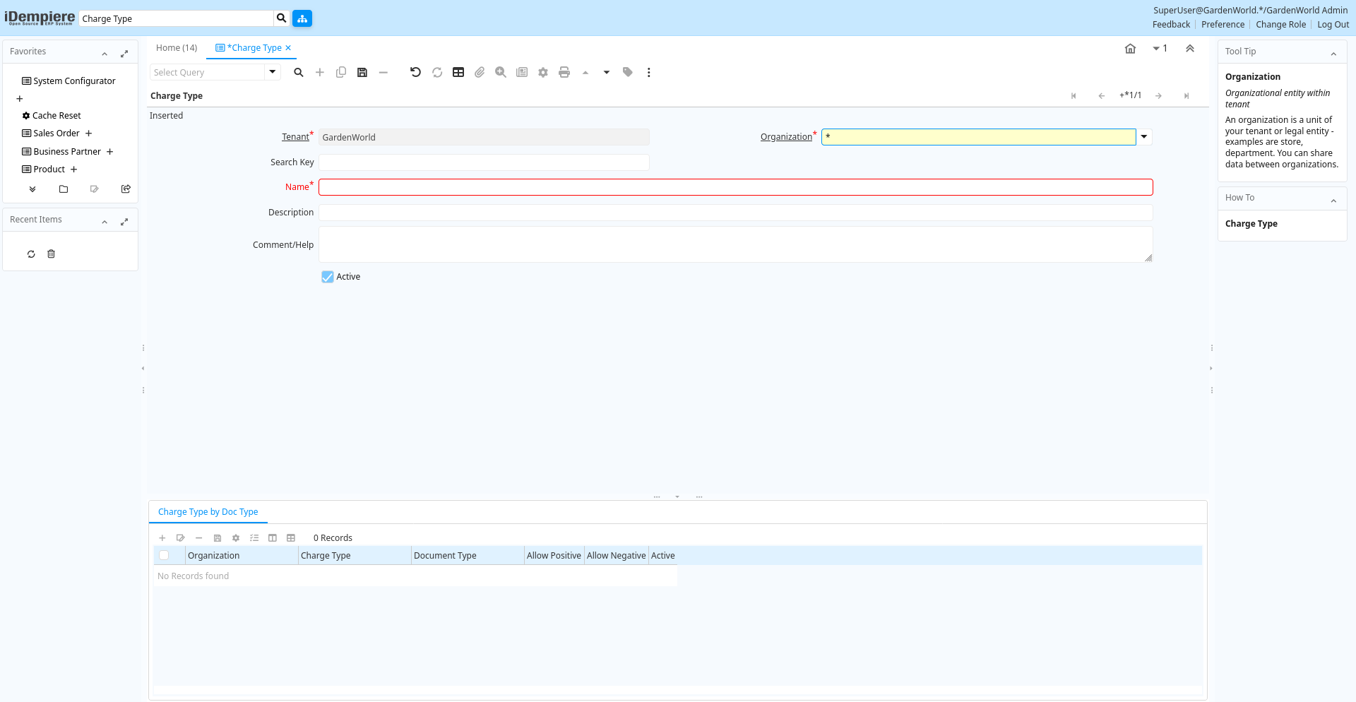 | Organization | Organizational entity within tenant | An organization is a unit of your tenant or legal entity - examples are store, department. You can share data between organizations. | c_chargetype_doctype.AD_Org_ID numeric(10) Table Direct |