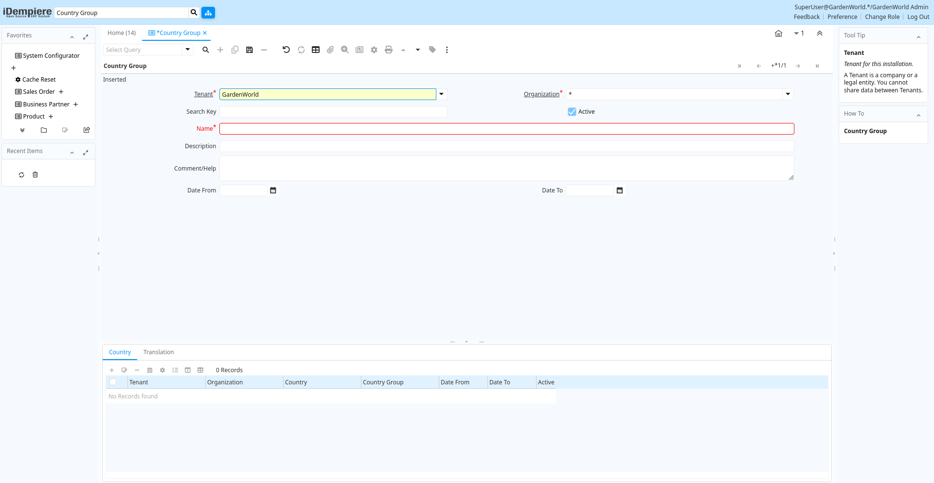 | Tenant | Tenant for this installation. | A Tenant is a company or a legal entity. You cannot share data between Tenants. | c_countrygroup_trl.AD_Client_ID numeric(10) Table Direct |