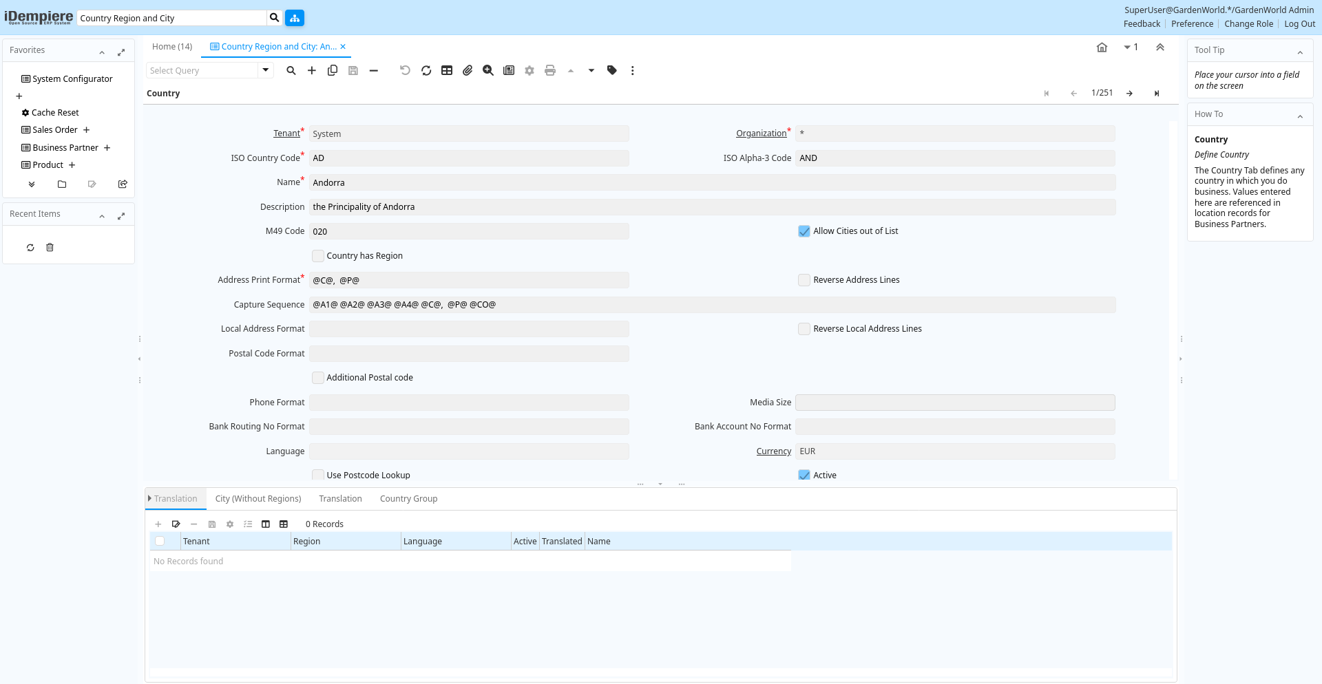 Help: The Countries, Regions and Cities Window defines the different entities that can be used in any address field. It defines the format of the address as well as associating Regions with Countries and Cities with Regions or Countries. You would define Countries usually only on System level.