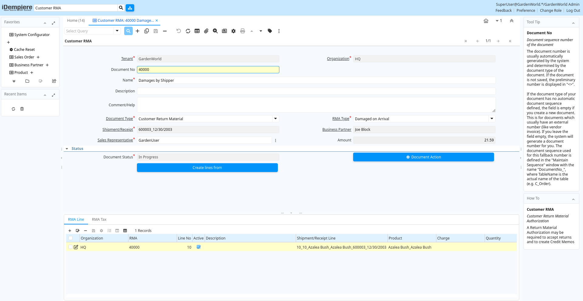 | Document Status | The current status of the document | The Document Status indicates the status of a document at this time. If you want to change the document status, use the Document Action field | m_rma.DocStatus character(2) List |