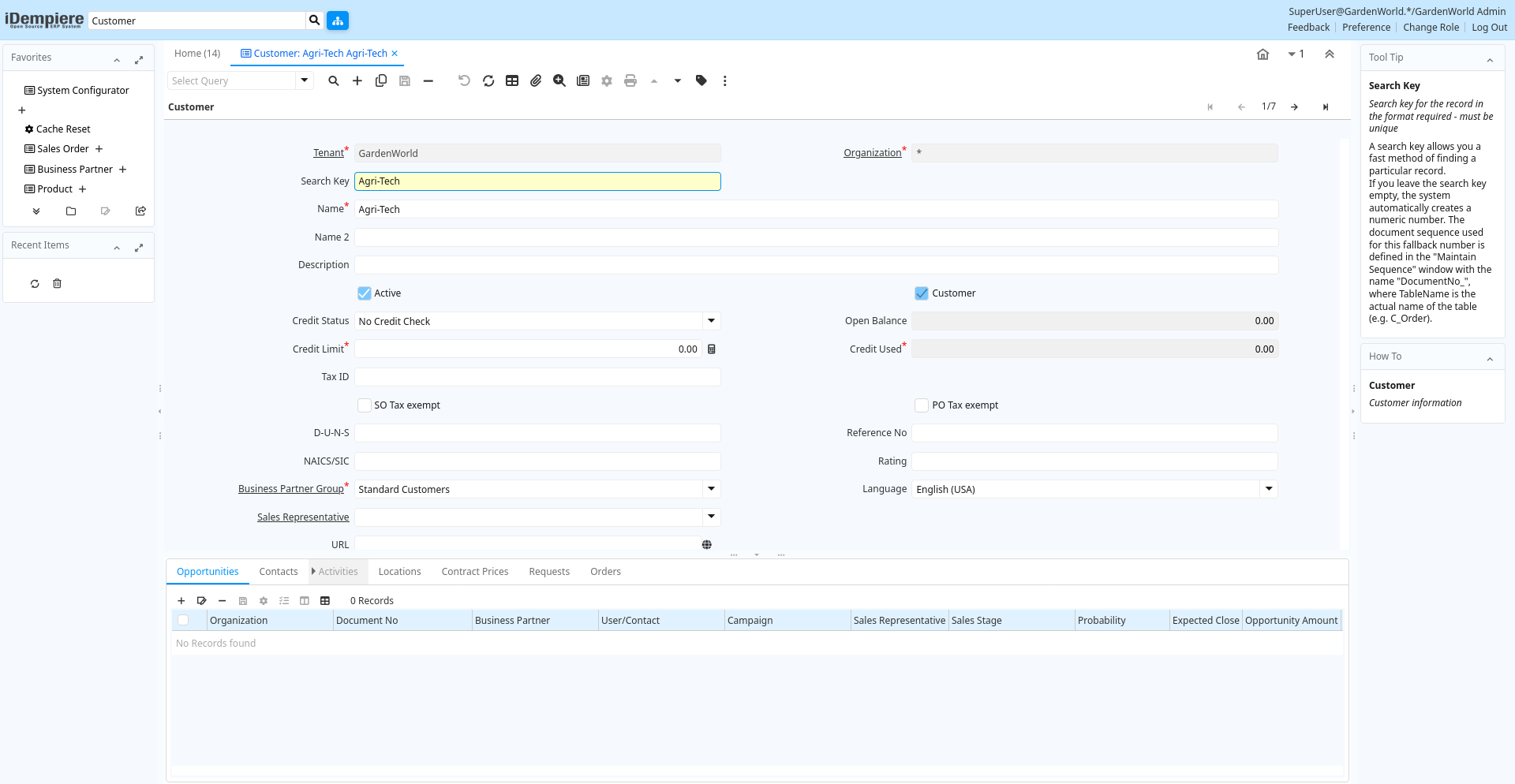 | Search Key | Search key for the record in the format required - must be unique | A search key allows you a fast method of finding a particular record.If you leave the search key empty, the system automatically creates a numeric number. The document sequence used for this fallback number is defined in the "Maintain Sequence" window with the name "DocumentNo_", where TableName is the actual name of the table (e.g. C_Order). | c_bpartner.Value character varying(40) String |