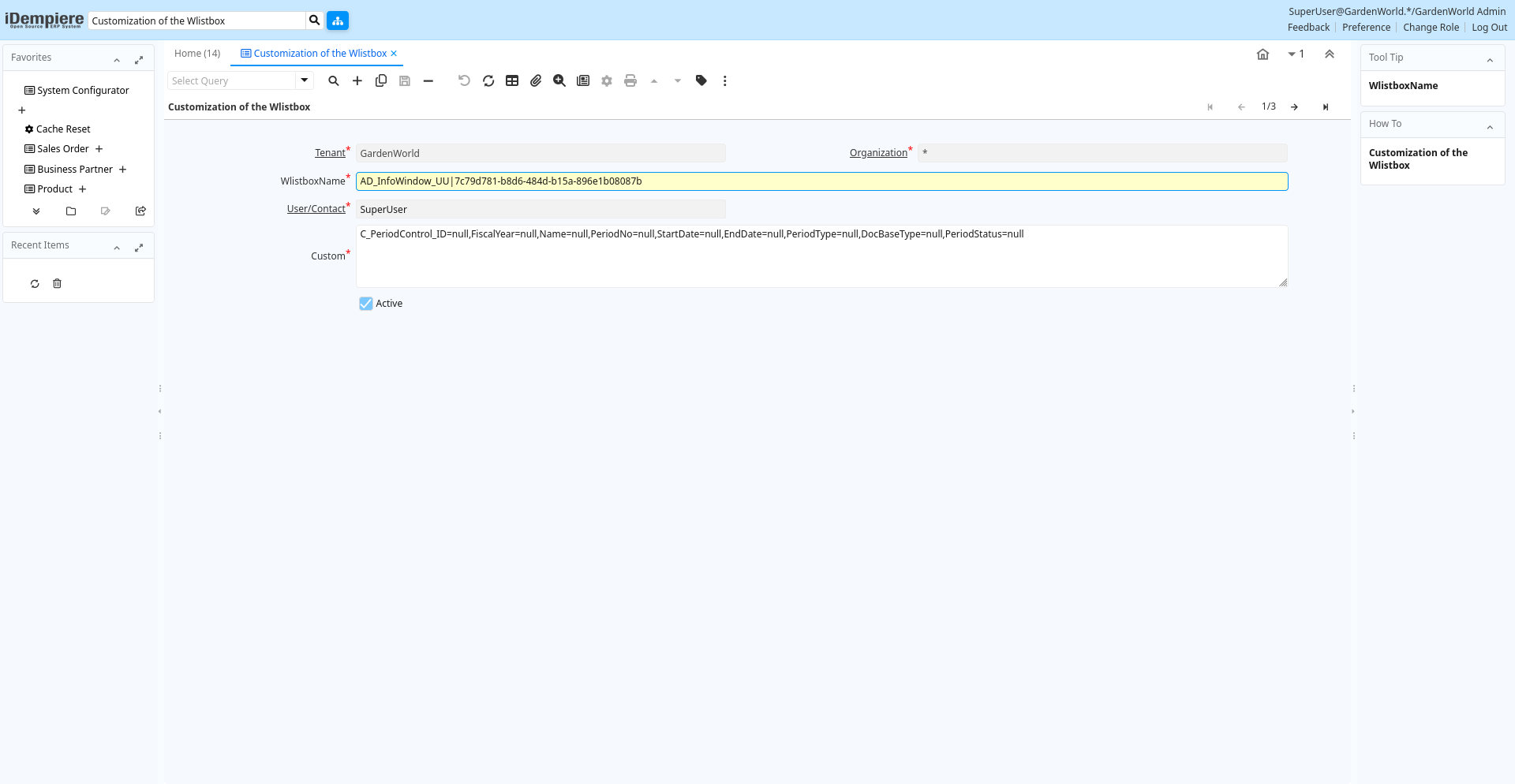 | Active | The record is active in the system | There are two methods of making records unavailable in the system: One is to delete the record, the other is to de-activate the record. A de-activated record is not available for selection, but available for reports.There are two reasons for de-activating and not deleting records:(1) The system requires the record for audit purposes.(2) The record is referenced by other records. E.g., you cannot delete a Business Partner, if there are invoices for this partner record existing. You de-activate the Business Partner and prevent that this record is used for future entries. | ad_wlistbox_customization.IsActive character(1) Yes-No |