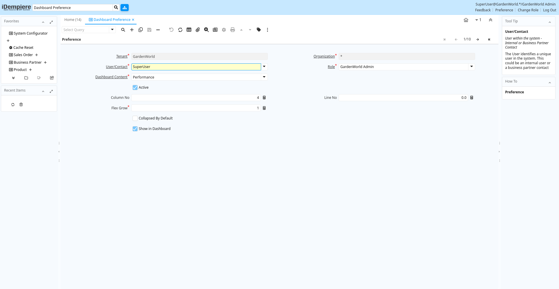 | Active | The record is active in the system | There are two methods of making records unavailable in the system: One is to delete the record, the other is to de-activate the record. A de-activated record is not available for selection, but available for reports.There are two reasons for de-activating and not deleting records:(1) The system requires the record for audit purposes.(2) The record is referenced by other records. E.g., you cannot delete a Business Partner, if there are invoices for this partner record existing. You de-activate the Business Partner and prevent that this record is used for future entries. | pa_dashboardpreference.IsActive character(1) Yes-No |