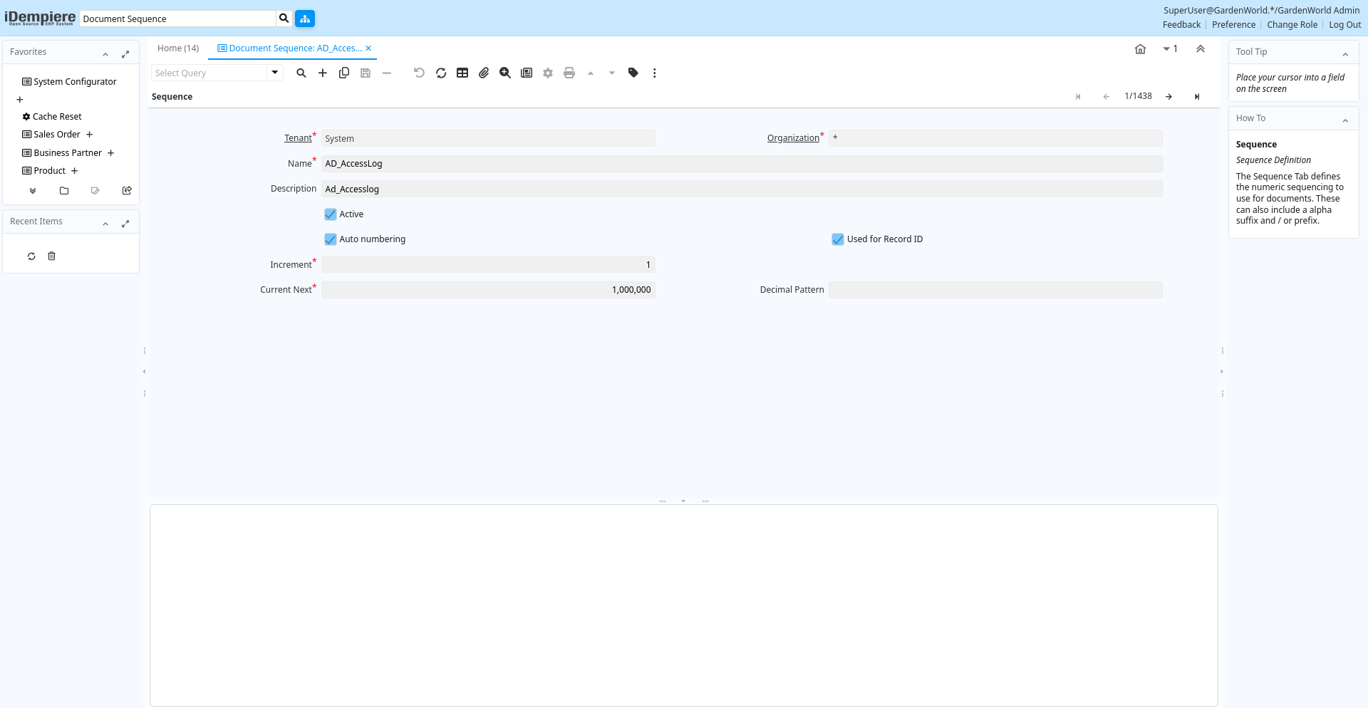 | Organization level | This sequence can be defined for each organization | ad_sequence.IsOrgLevelSequence character(1) Yes-No | |