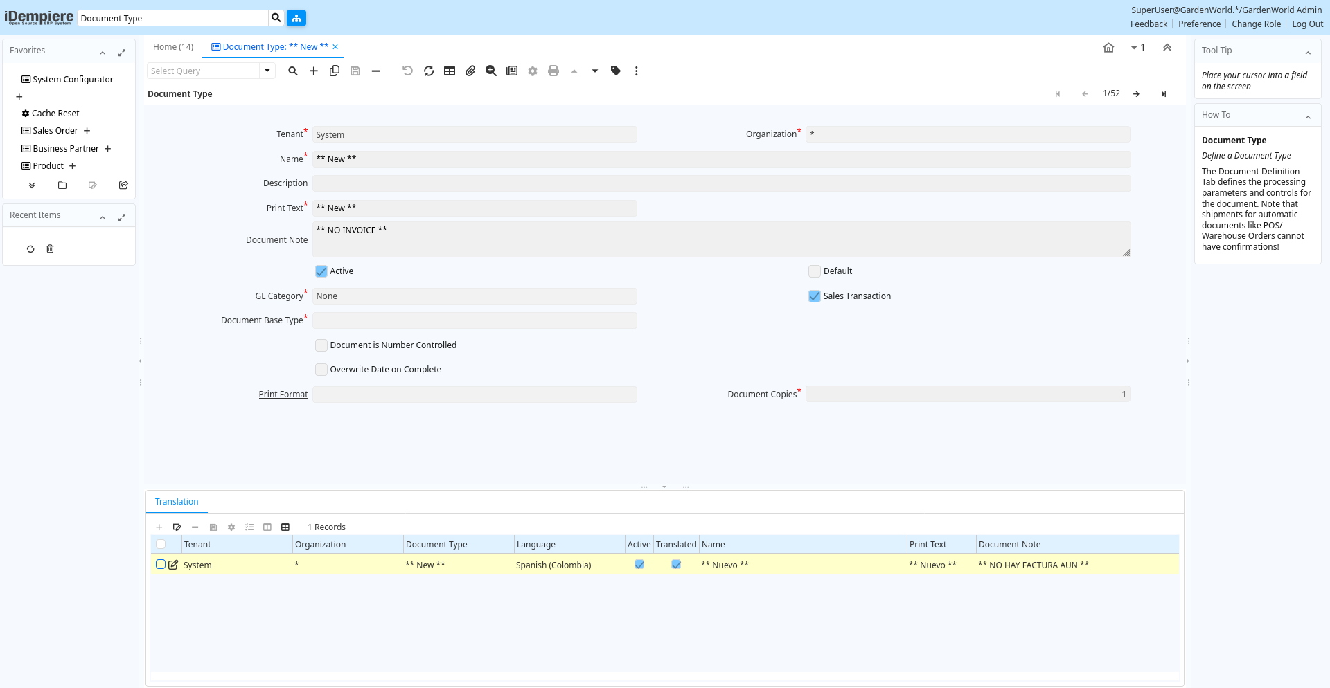 Help: The Translation Tab defines a Document Type in an alternate language.