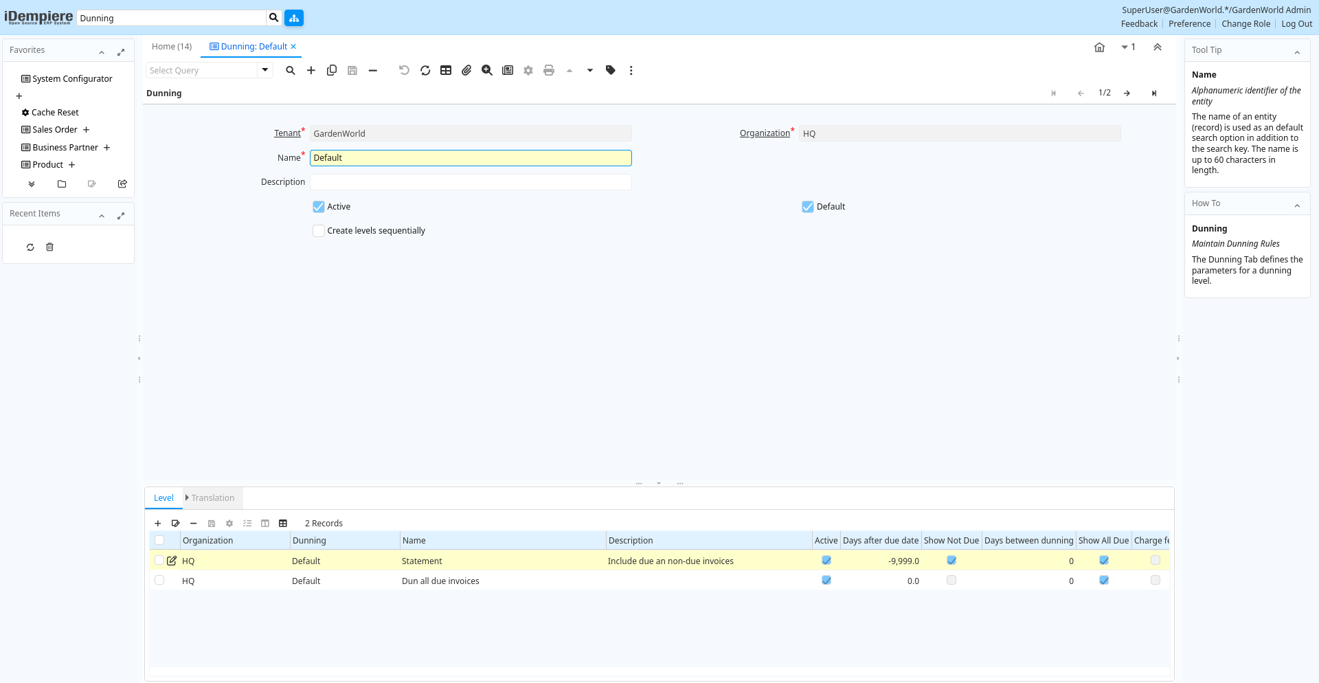 | Name | Alphanumeric identifier of the entity | The name of an entity (record) is used as an default search option in addition to the search key. The name is up to 60 characters in length. | c_dunninglevel.Name character varying(60) String |