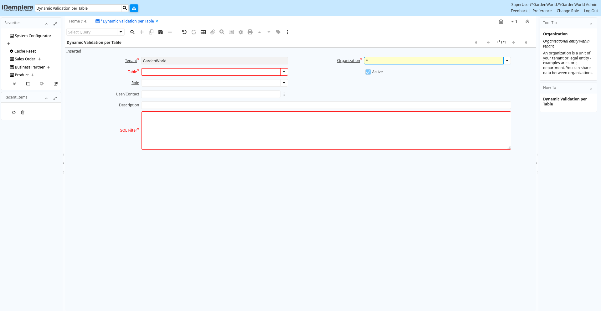 | Tenant | Tenant for this installation. | A Tenant is a company or a legal entity. You cannot share data between Tenants. | ad_tablevalrule.AD_Client_ID numeric(10) Search |