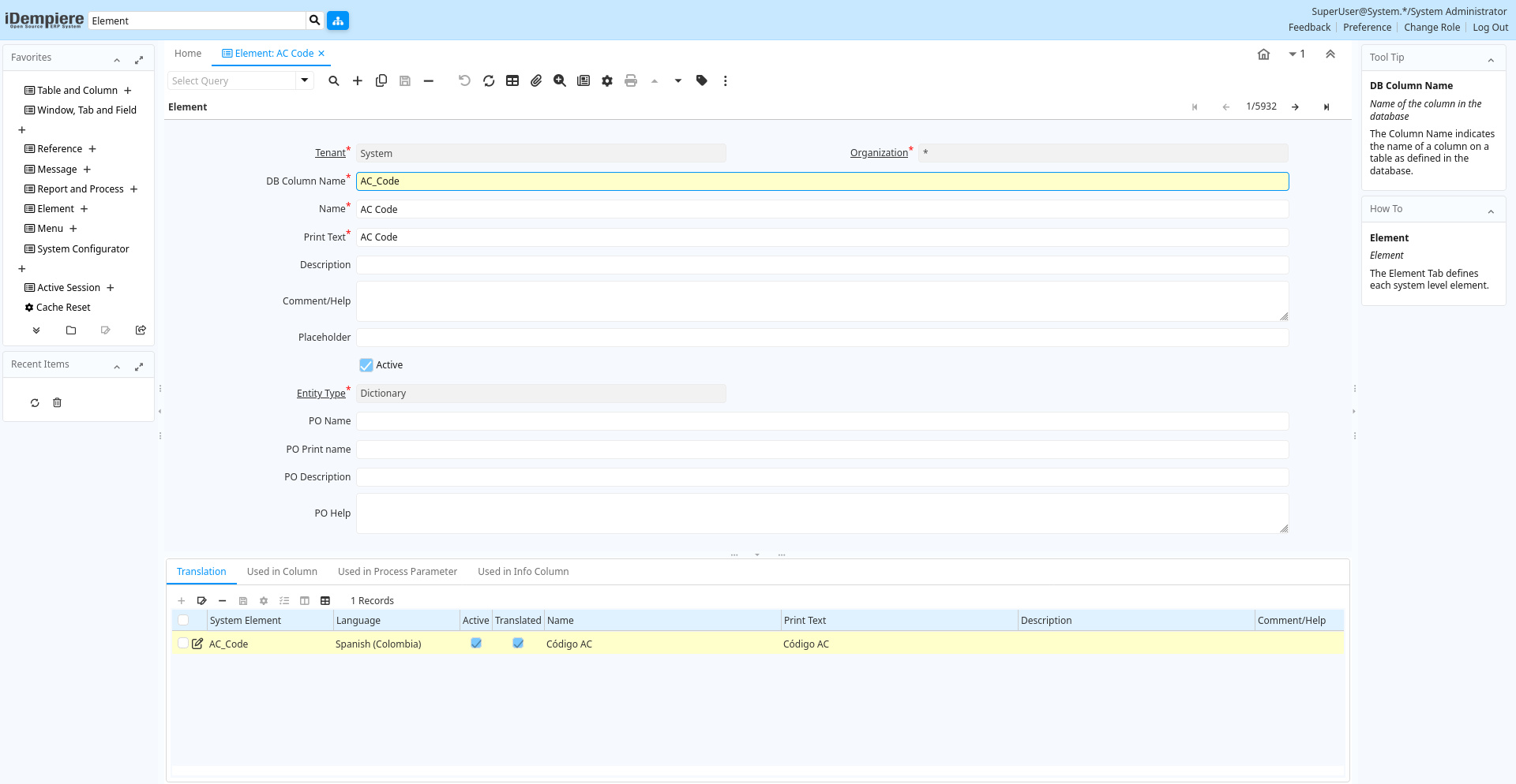 | System Element | System Element enables the central maintenance of column description and help. | The System Element allows for the central maintenance of help, descriptions and terminology for a database column. | ad_element_trl.AD_Element_ID numeric(10) Search |