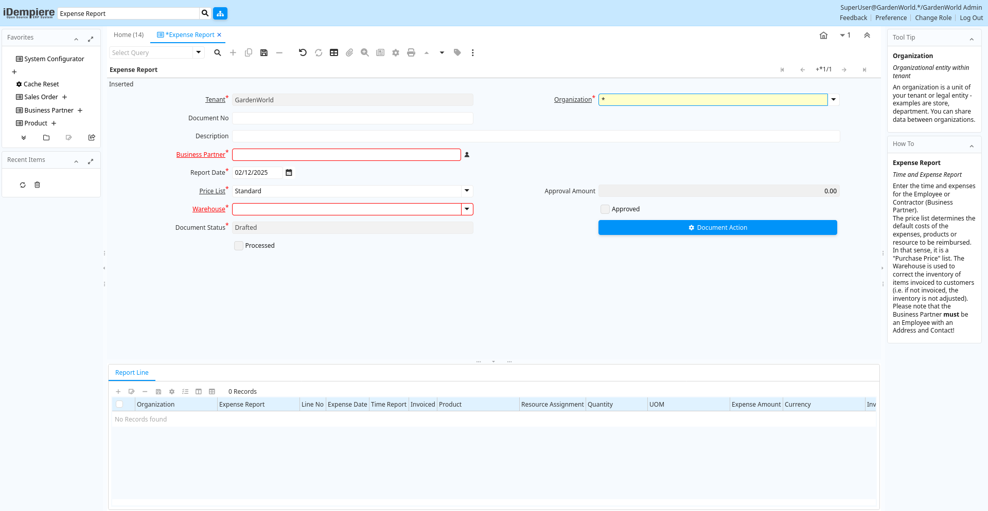 Help: Enter the time and expenses for the Employee or Contractor (Business Partner). The price list determines the default costs of the expenses, products or resource to be reimbursed. In that sense, it is a "Purchase Price" list. The Warehouse is used to correct the inventory of items invoiced to customers (i.e. if not invoiced, the inventory is not adjusted).Please note that the Business Partner must be an Employee with an Address and Contact!