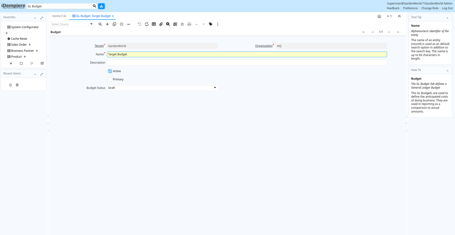 | Tenant | Tenant for this installation. | A Tenant is a company or a legal entity. You cannot share data between Tenants. | gl_budget.AD_Client_ID numeric(10) Table Direct |