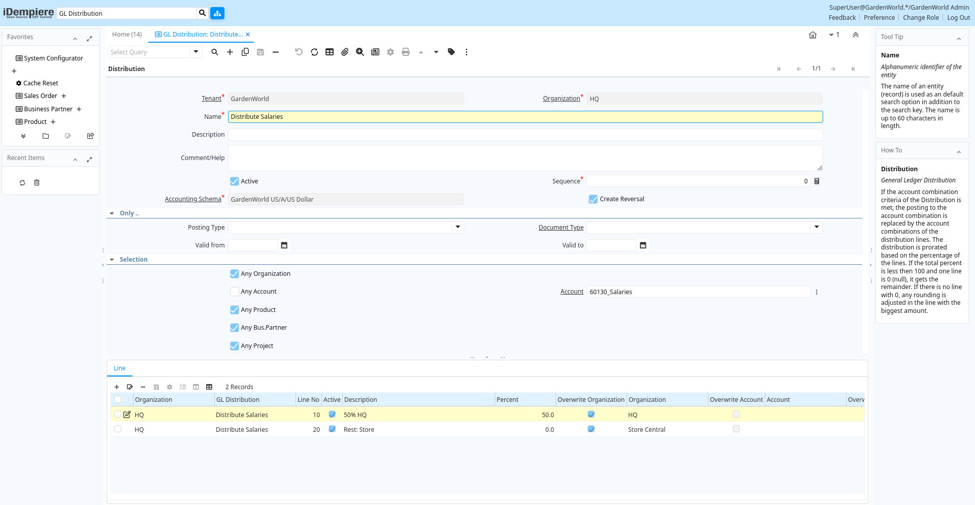 Help: If the account combination criteria of the Distribution is met, the posting to the account combination is replaced by the account combinations of the distribution lines. The distribution is prorated based on the percentage of the lines. If the total percent is less then 100 and one line is 0 (null), it gets the remainder. If there is no line with 0, any rounding is adjusted in the line with the biggest amount.