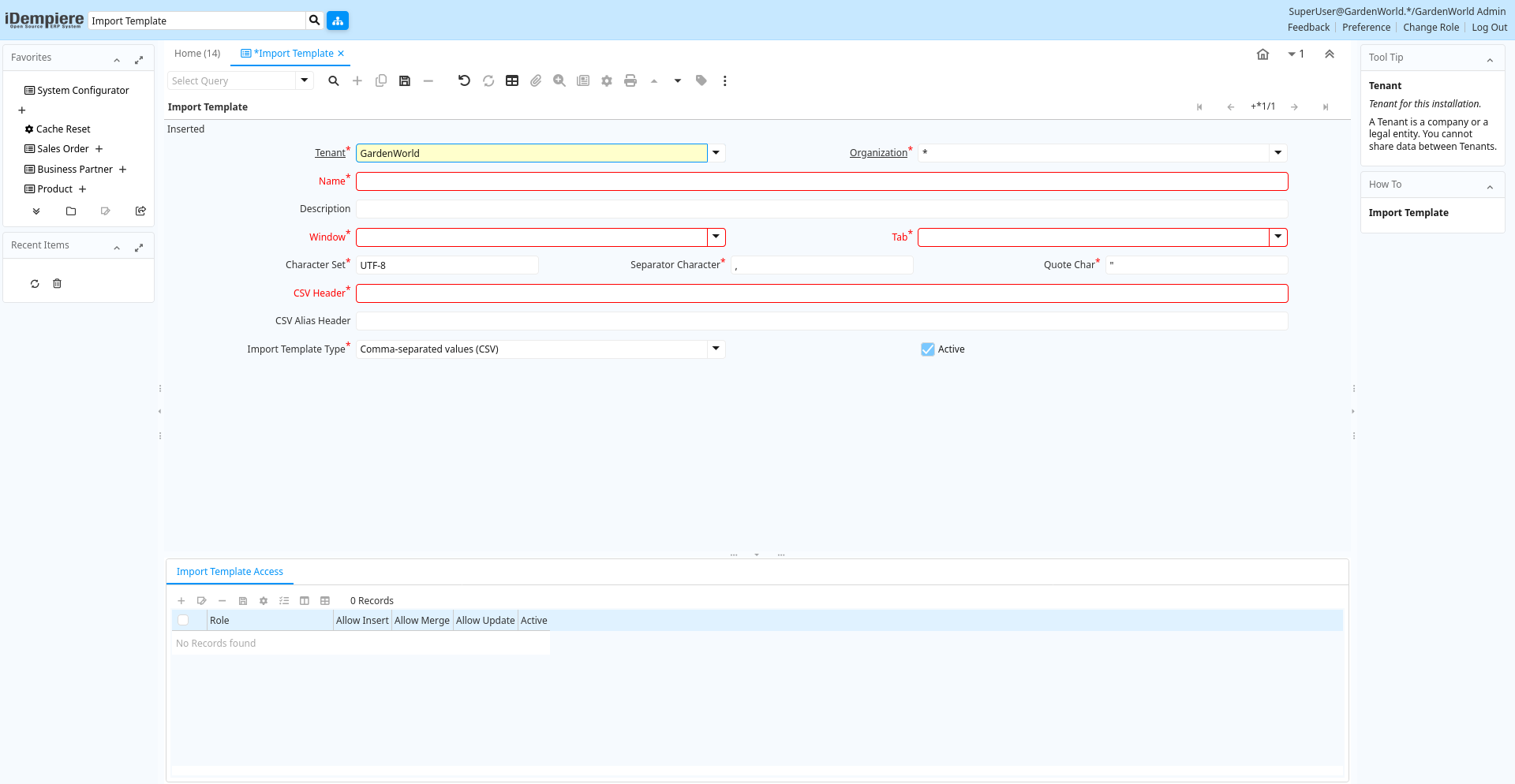 | Tenant | Tenant for this installation. | A Tenant is a company or a legal entity. You cannot share data between Tenants. | ad_importtemplateaccess.AD_Client_ID numeric(10) Table Direct |