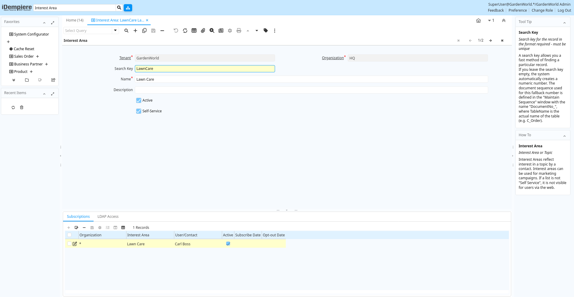 | Active | The record is active in the system | There are two methods of making records unavailable in the system: One is to delete the record, the other is to de-activate the record. A de-activated record is not available for selection, but available for reports.There are two reasons for de-activating and not deleting records:(1) The system requires the record for audit purposes.(2) The record is referenced by other records. E.g., you cannot delete a Business Partner, if there are invoices for this partner record existing. You de-activate the Business Partner and prevent that this record is used for future entries. | r_interestarea.IsActive character(1) Yes-No |