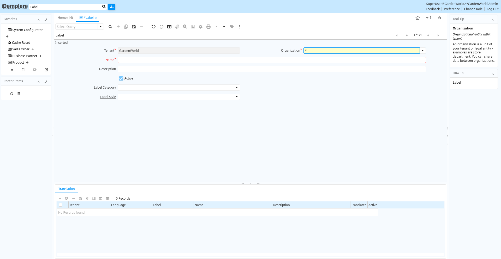 | Organization | Organizational entity within tenant | An organization is a unit of your tenant or legal entity - examples are store, department. You can share data between organizations. | ad_label_trl.AD_Org_ID numeric(10) Table Direct |