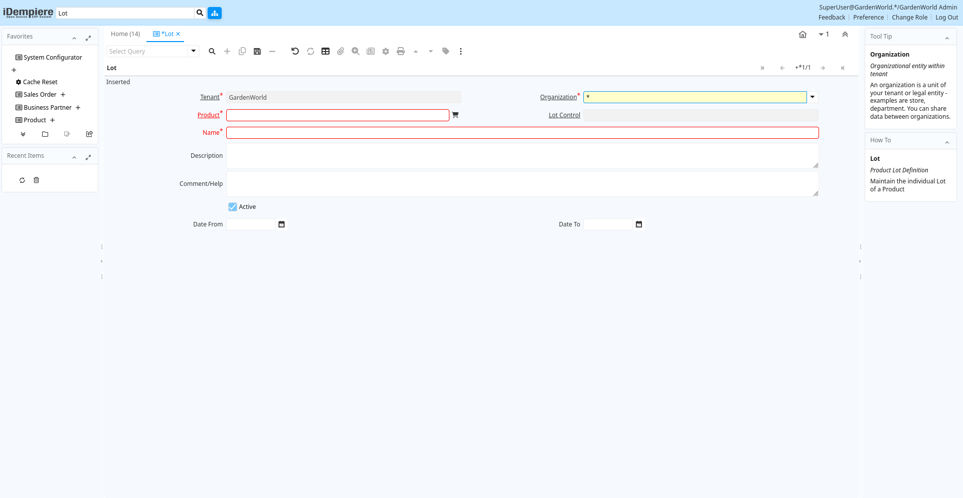 | Tenant | Tenant for this installation. | A Tenant is a company or a legal entity. You cannot share data between Tenants. | m_lot.AD_Client_ID numeric(10) Table Direct |