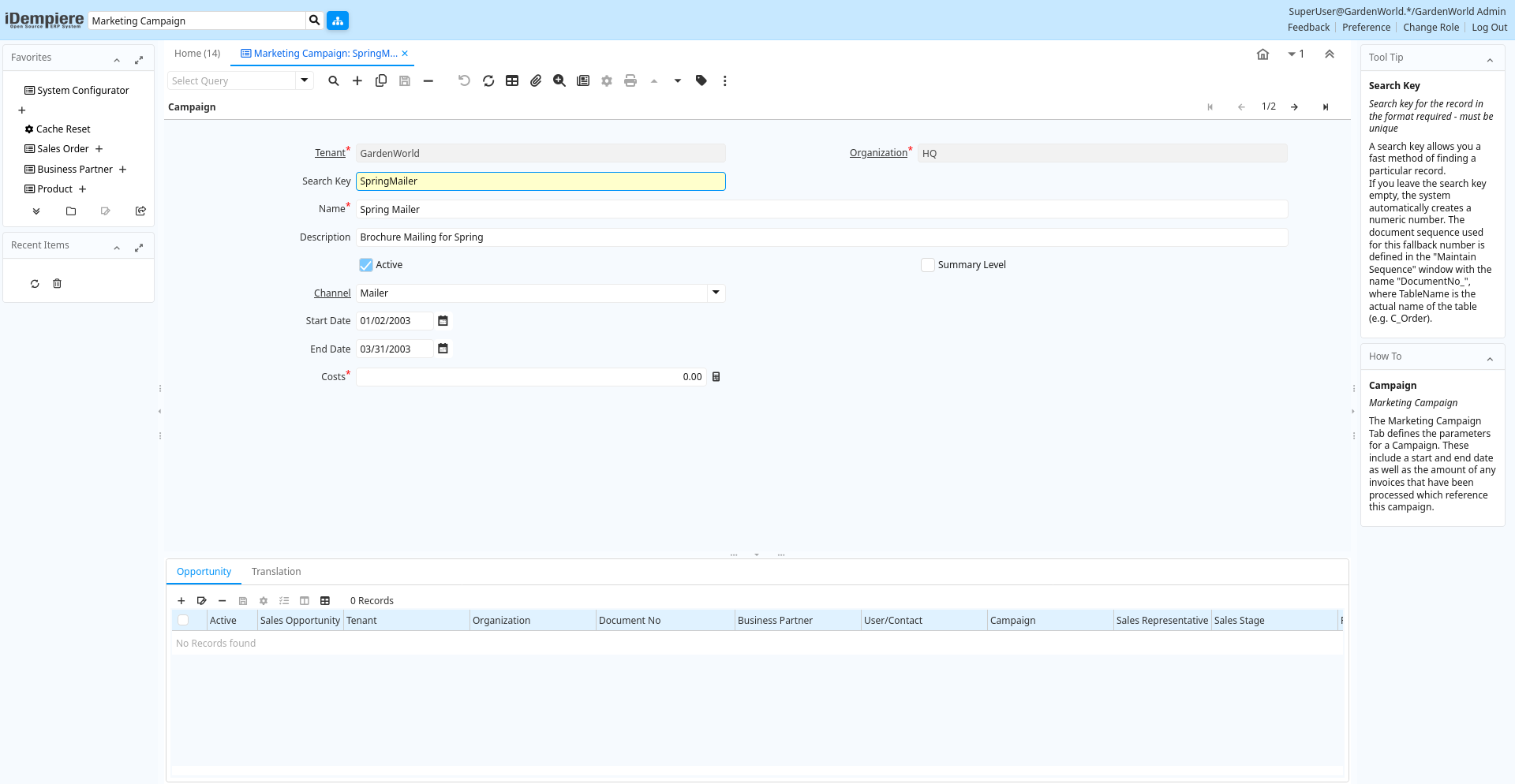 | Campaign | Marketing Campaign | The Campaign defines a unique marketing program. Projects can be associated with a pre defined Marketing Campaign. You can then report based on a specific Campaign. | c_campaign_trl.C_Campaign_ID numeric(10) Search |