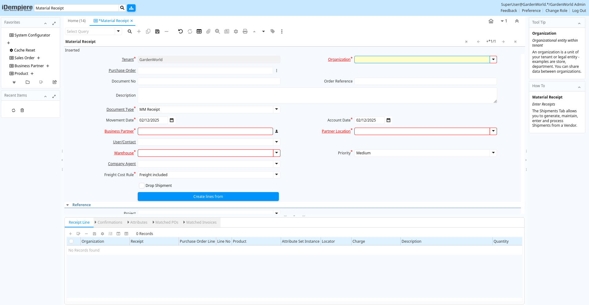 Help: The Vendor Shipment Window defines the receipt of product or material from a Vendor. The Shipment may be manually entered or may be generated from a Purchase Order or Vendor Invoice.