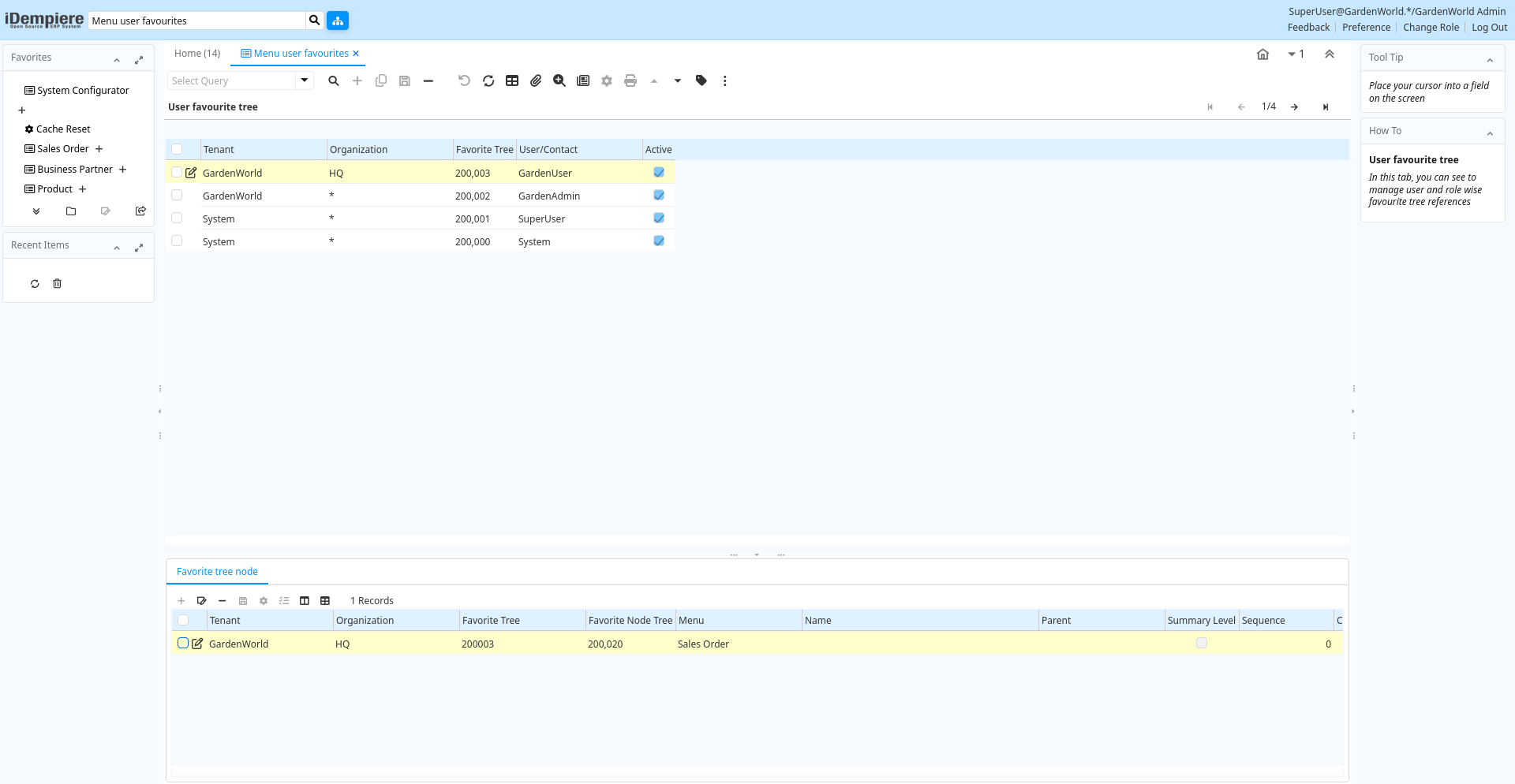Description: In this tab, you can see to manage user and role wise favourite tree references