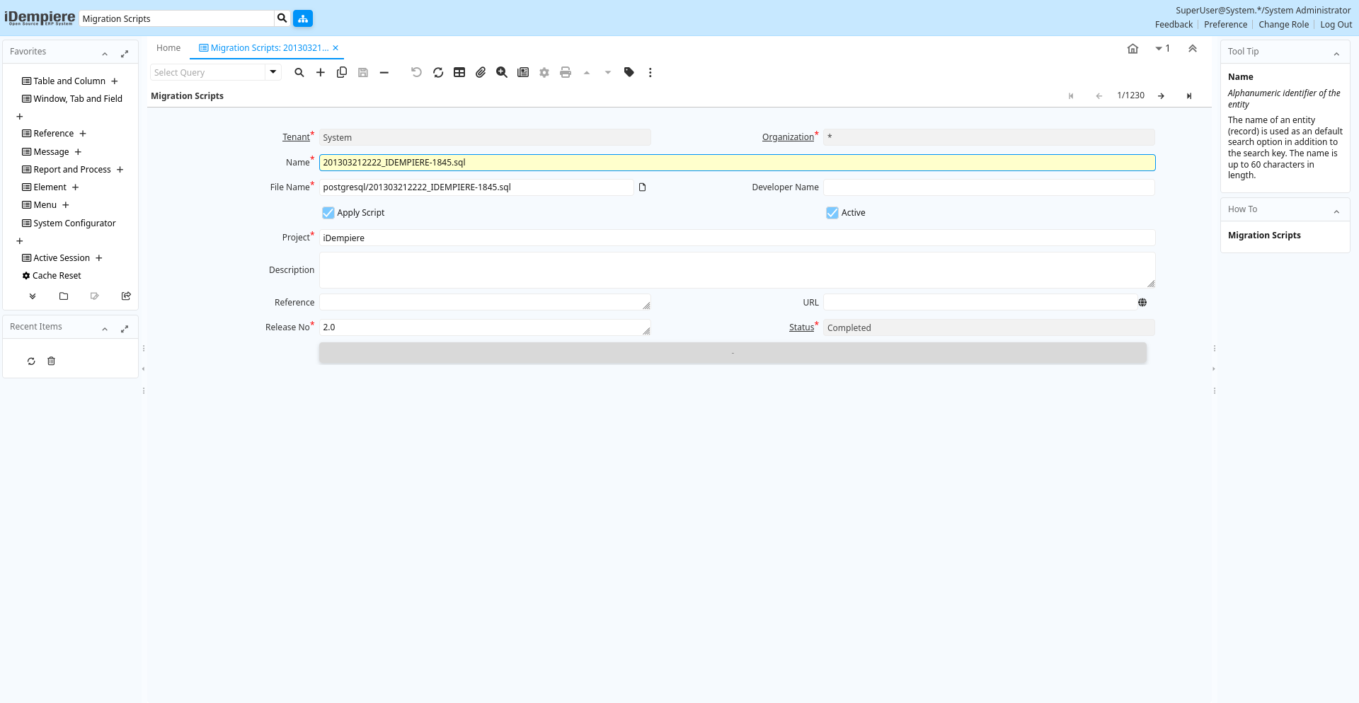 | Name | Alphanumeric identifier of the entity | The name of an entity (record) is used as an default search option in addition to the search key. The name is up to 60 characters in length. | ad_migrationscript.Name character varying(60) String |